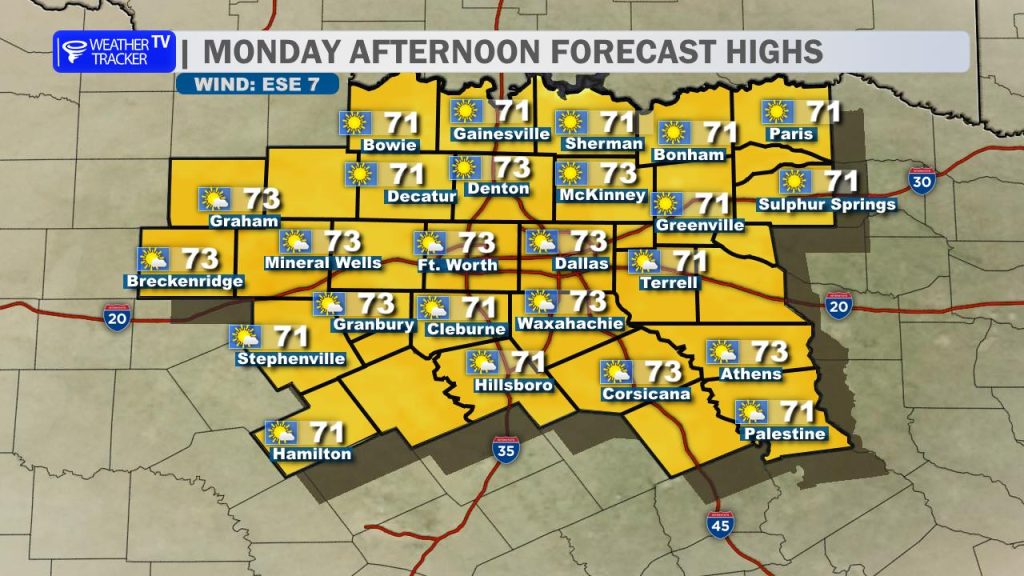 Expect wall-to-wall sunshine for the rest of your Monday. With a very light easterly breeze and dry air in place, conditions are nearly perfect. Highs will climb comfortably into the low to mid 70s. If you have outdoor plans, today is easily the “pick day” of the entire week.
