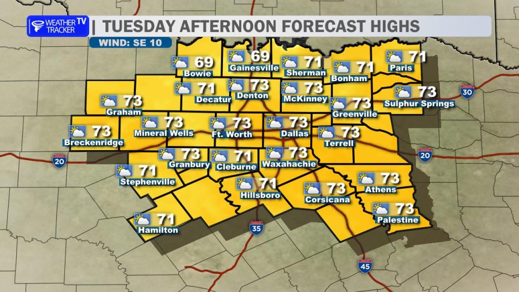 • Tuesday: We’ll see an increase in cloud cover as a weak, moisture-starved storm system approaches from the west. Highs will remain pleasant, generally staying in the 70s.