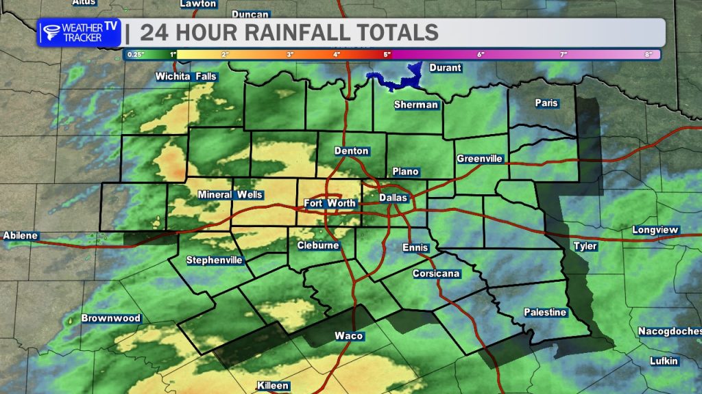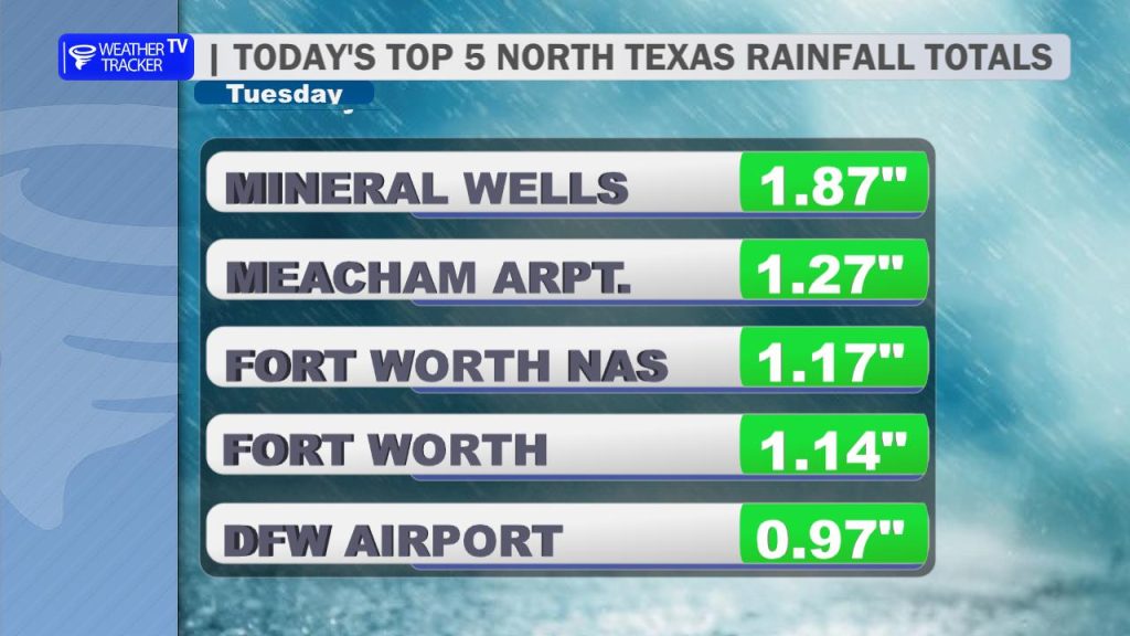 3:40 PM Radar: A lot of the scattered showery activity continues to taper off. Rainfall totals have been generous – a great spring rain! Mineral Wells has been the “winner,” pushing nearly 2″. 🌧️📈
