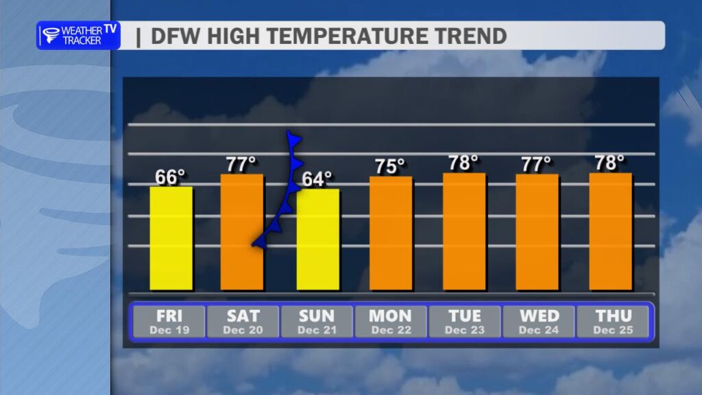 That warmer pattern holds strong right through Christmas week. We’ll see highs in the 70s Tuesday and Wednesday, pushing toward 80° on Christmas Eve and Christmas Day itself. Christmas Day currently looks mostly sunny and unseasonably warm with a high near 80° – just a couple of degrees shy of the record high of 82° set back in 2021. A very Texas-style holiday forecast.