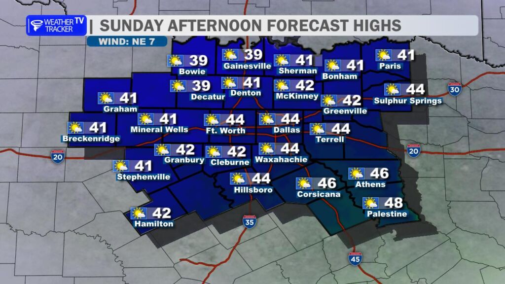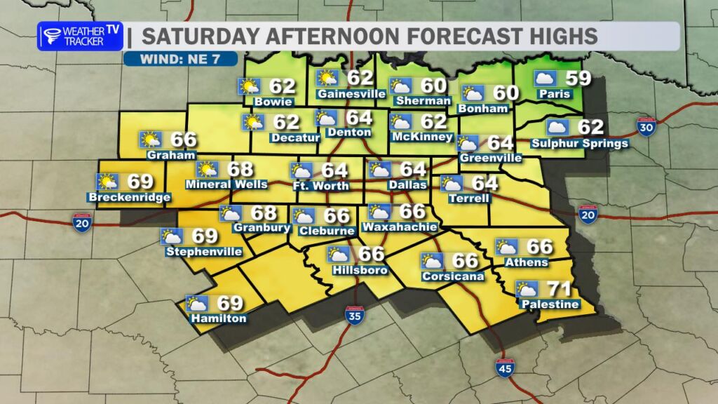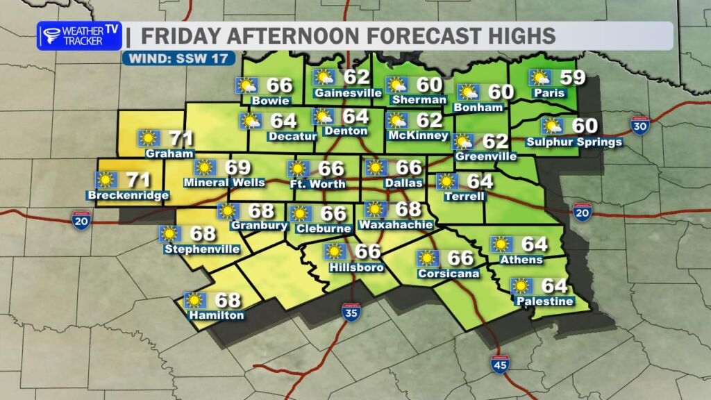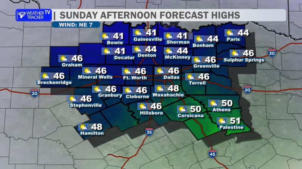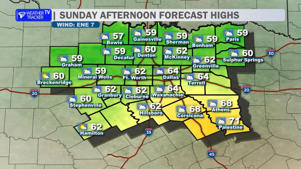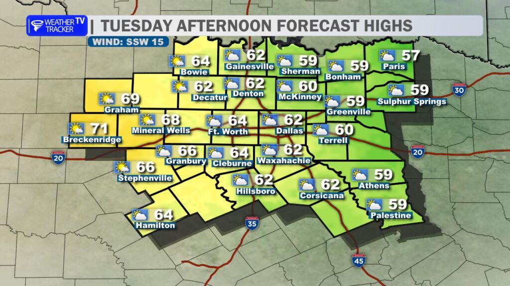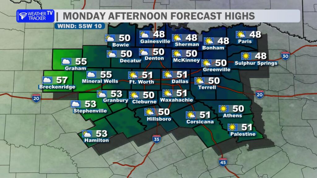 After yesterday’s record-breaking warmth at DFW Airport, we’re settling back into more seasonal conditions today. A cold front swept through overnight, bringing a noticeable change. High temperatures this afternoon will range from the mid-50s north of the Metroplex to the low to mid-60s farther south, a solid 15-20 degrees cooler than Saturday. Expect a brisk north wind at 10-20 mph with occasional gusts near 25 mph, which will make it feel even cooler.