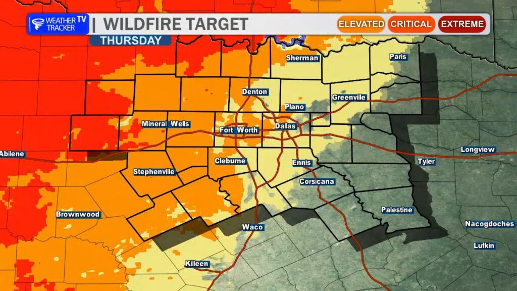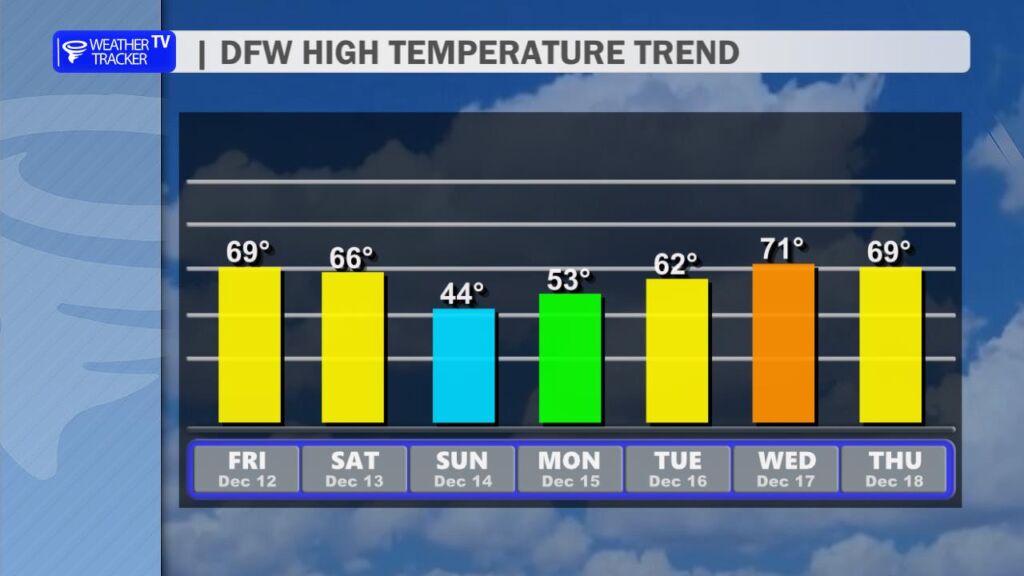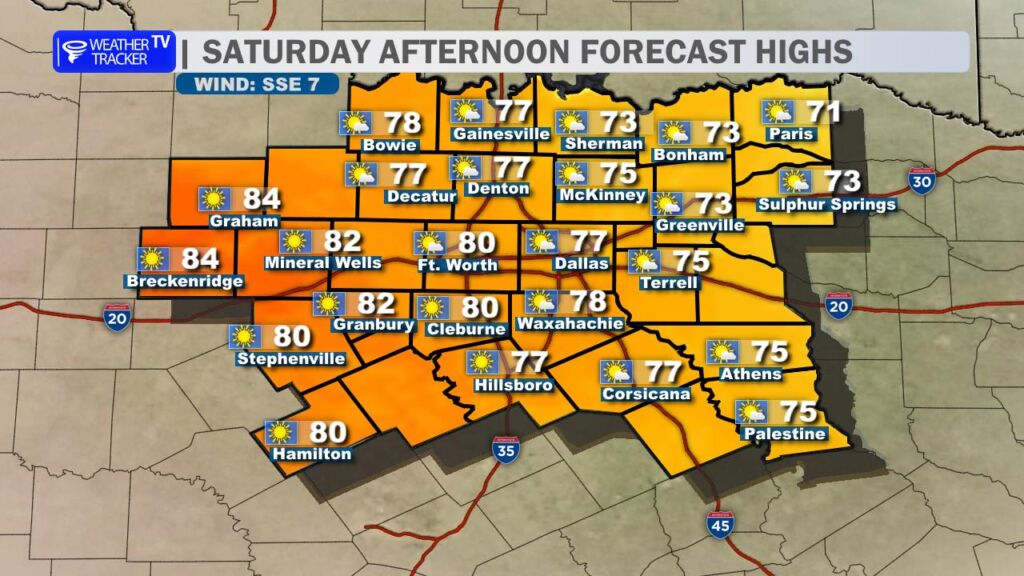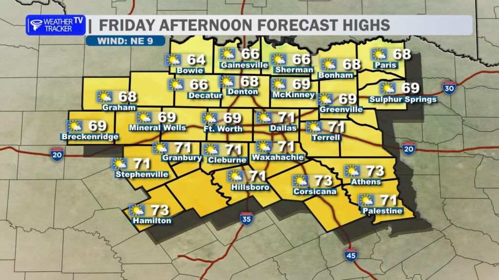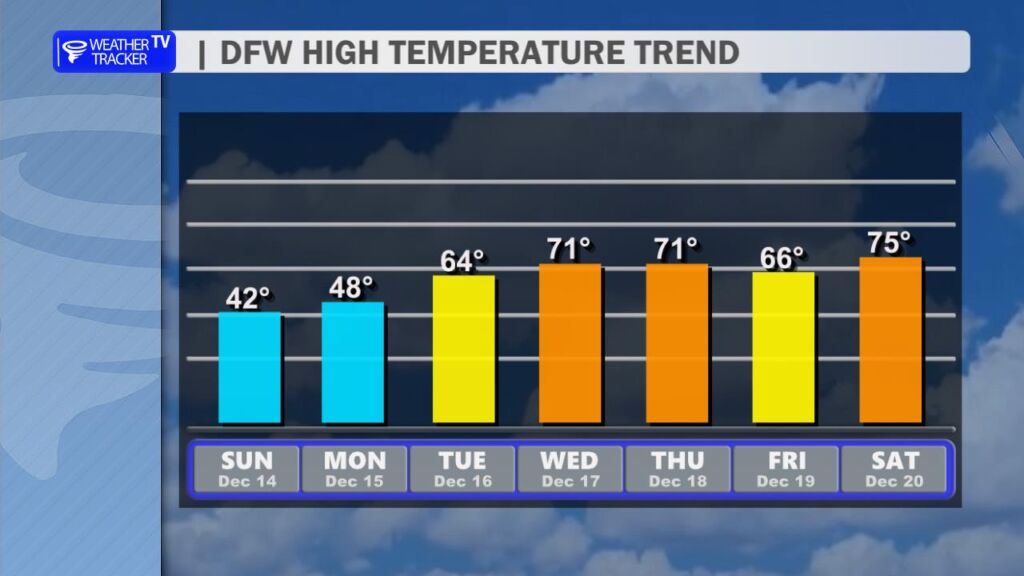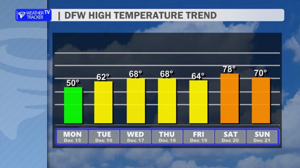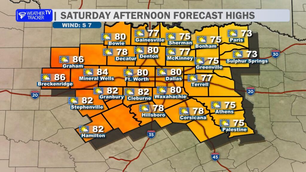 After yesterday’s record-breaking warmth at DFW Airport, we’re settling back into more seasonal conditions today. A cold front swept through overnight, bringing a noticeable change. High temperatures this afternoon will range from the mid-50s north of the Metroplex to the low to mid-60s farther south, a solid 15-20 degrees cooler than Saturday. Expect a brisk north wind at 10-20 mph with occasional gusts near 25 mph, which will make it feel even cooler.