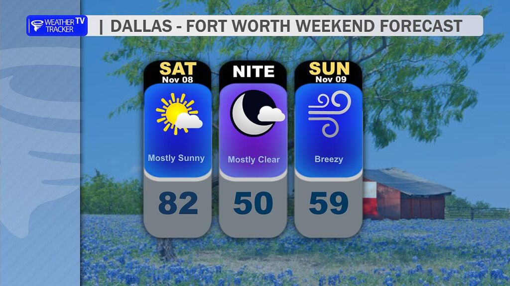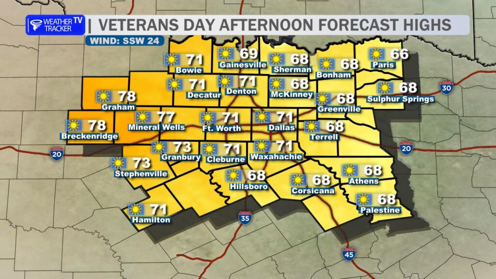 - Dallas Veterans Day Parade (Downtown): Sunny, near 60 at 11 AM, winds gusting 25–30 mph