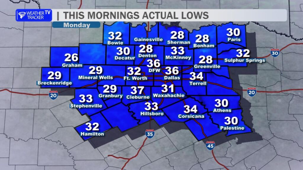 - Rain totals: 0.25″–0.75″ (locally higher north/east of DFW)