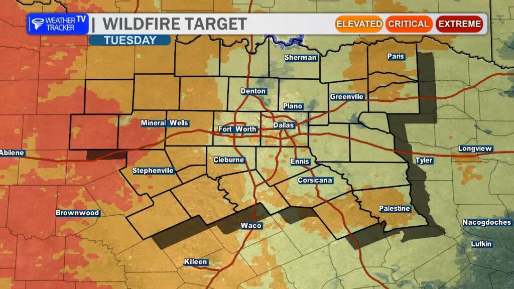 Counties under heightened concern: Dallas, Tarrant, Collin, Denton, Parker, Wise, and points west toward the Big Country.