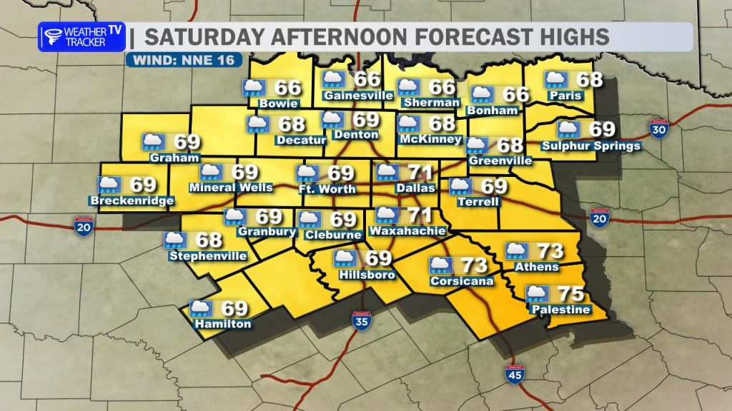Saturday: Rain and storm activity will taper off from northwest to southeast through the afternoon. It will feel noticeably cooler behind the front, with clearing skies and highs struggling to reach the upper 60s.