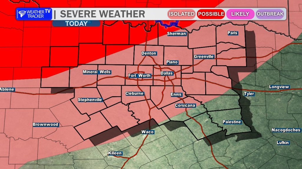 This Evening: The risk of severe weather increases, especially for areas west and northwest of the Metroplex (Level 2 “Slight” Risk). Initially, discrete storms are expected to form along the dryline in the Big Country before pushing east into North Texas. These could be supercells capable of producing ping-pong ball-sized hail and wind gusts up to 65 mph. While the tornado threat is low, a brief spin-up cannot be ruled out as the activity expands.